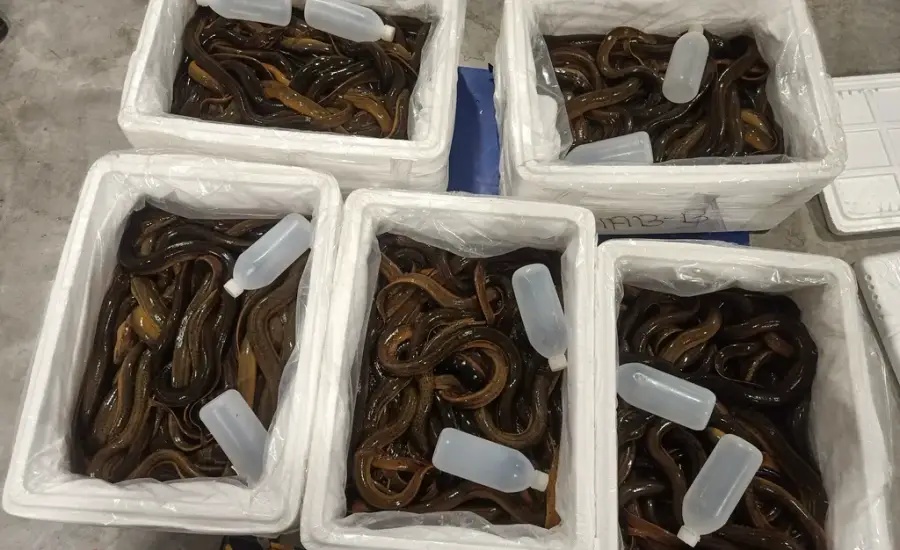 这是重庆机场进境食用水生动物指定监管场地迎来的首批次全货机承运的活体黄鳝保障任务,于本月11日和22日共计运送了46.4吨。