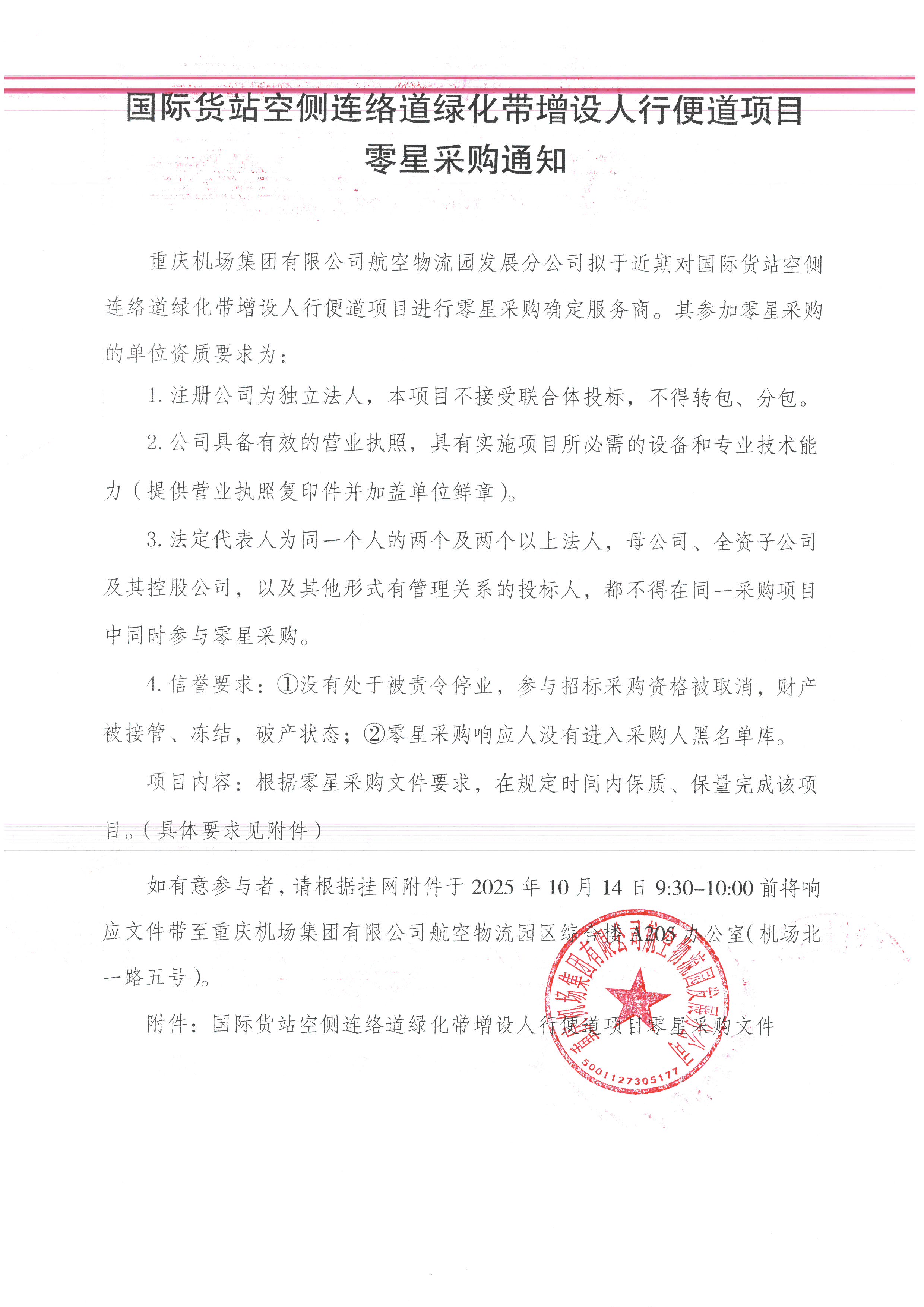 国际货站空侧连络道绿化带增设人行便道项目零星采购通知