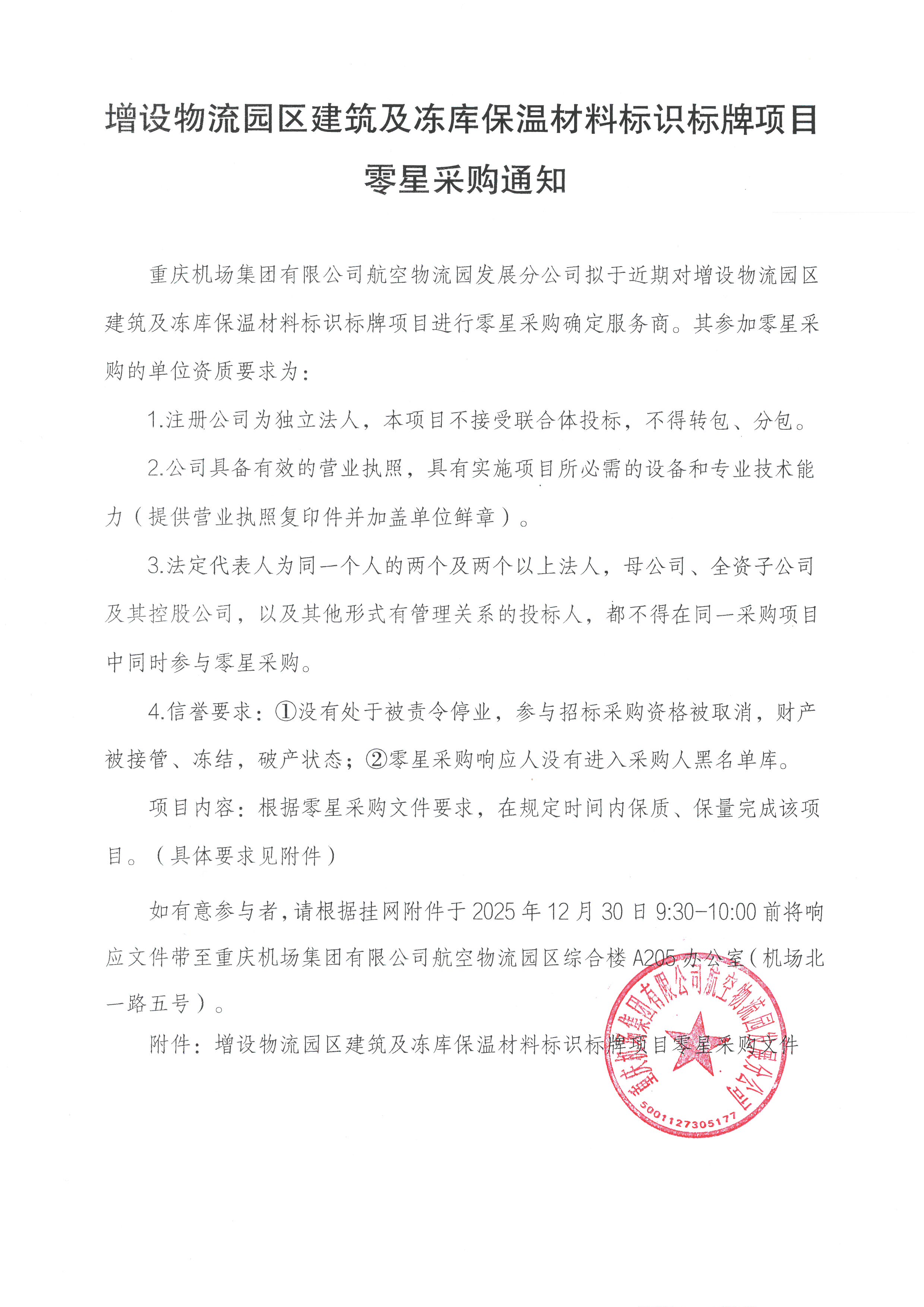 增设物流园区建筑及冻库保温材料标识标牌项目零星采购通知