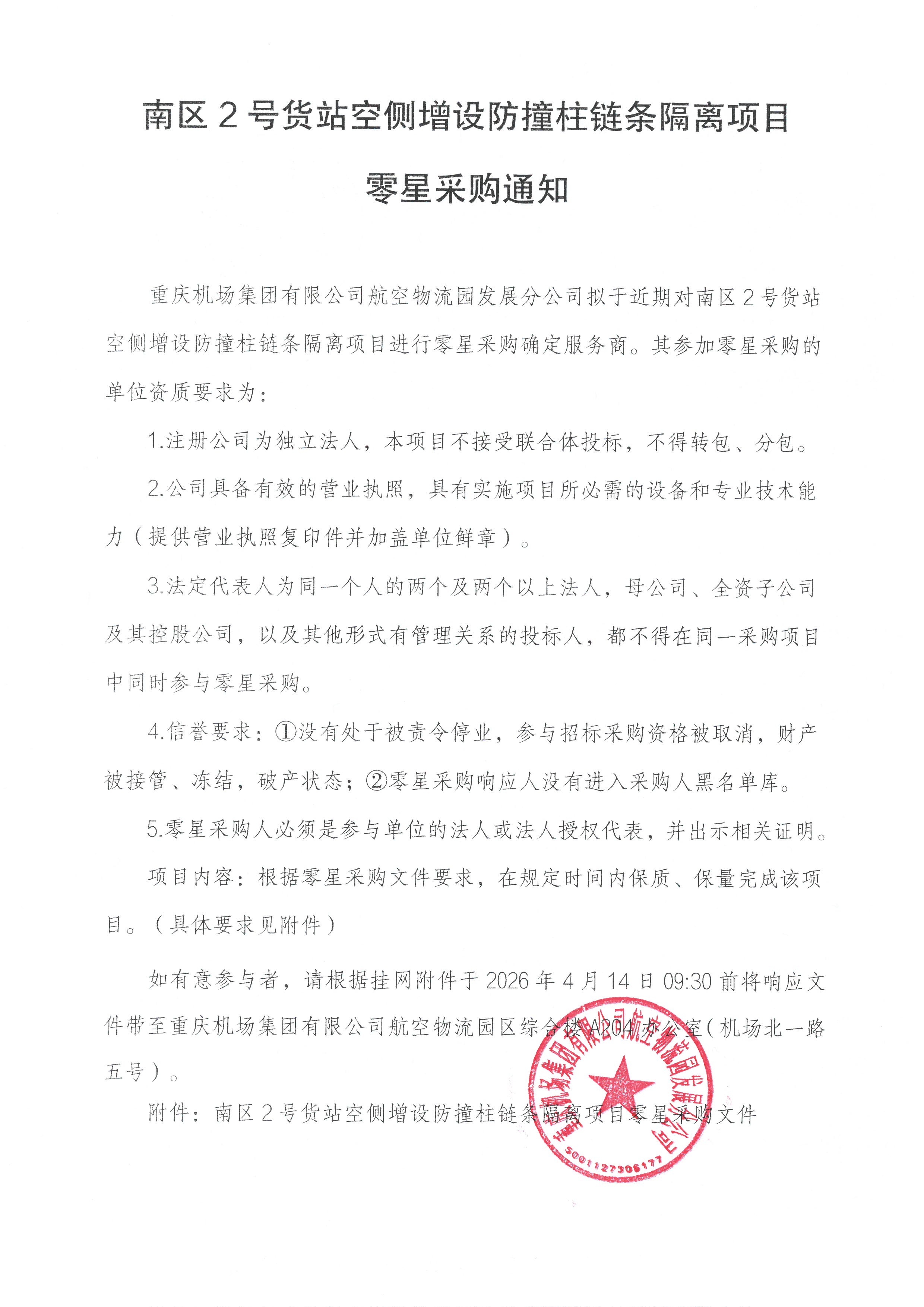 南区2号货站空侧增设防撞柱链条隔离项目零星采购通知